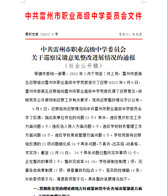 中共雷州市职业高级中学委员会关于巡察反馈意见整改进展情况的通报